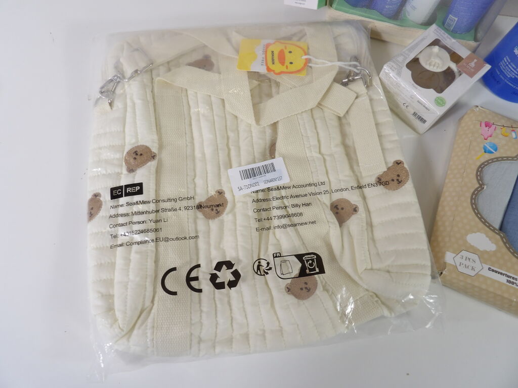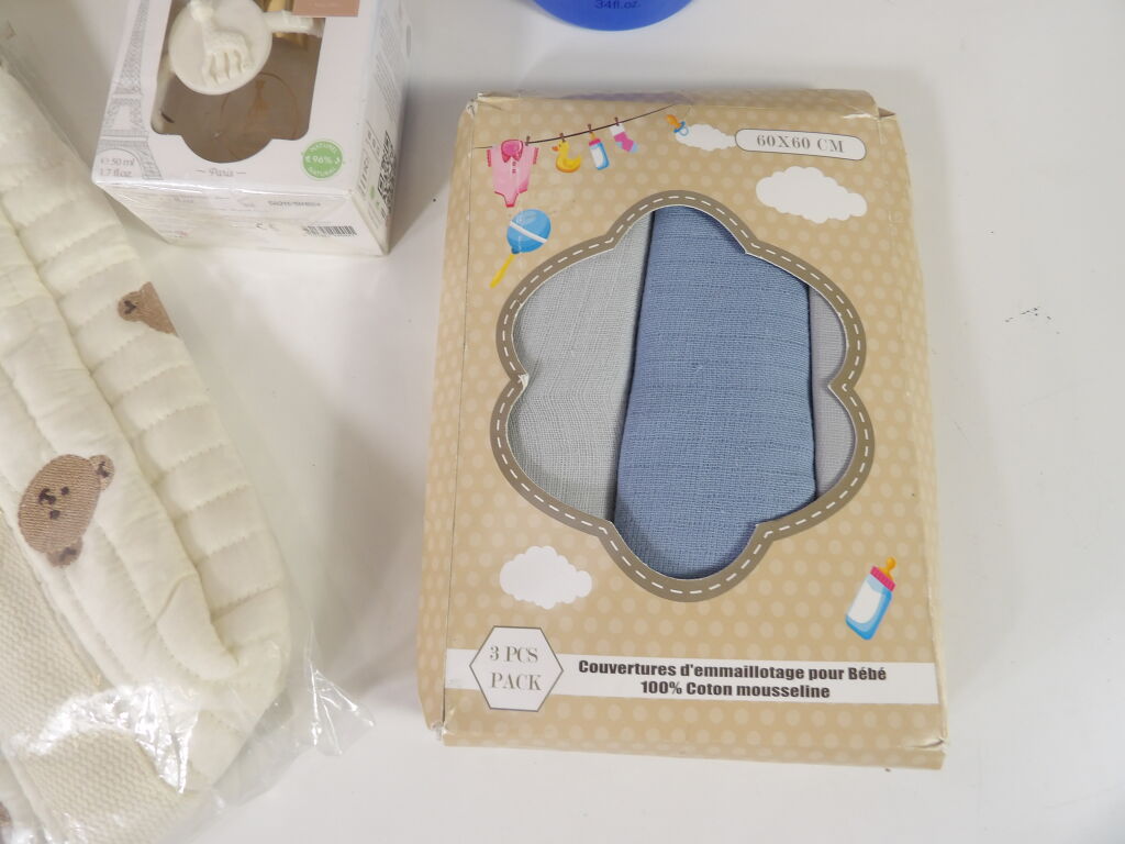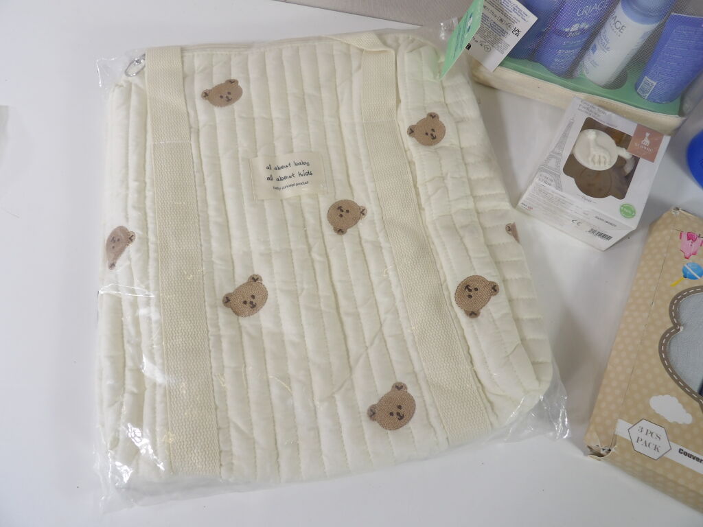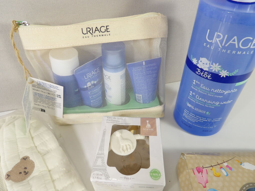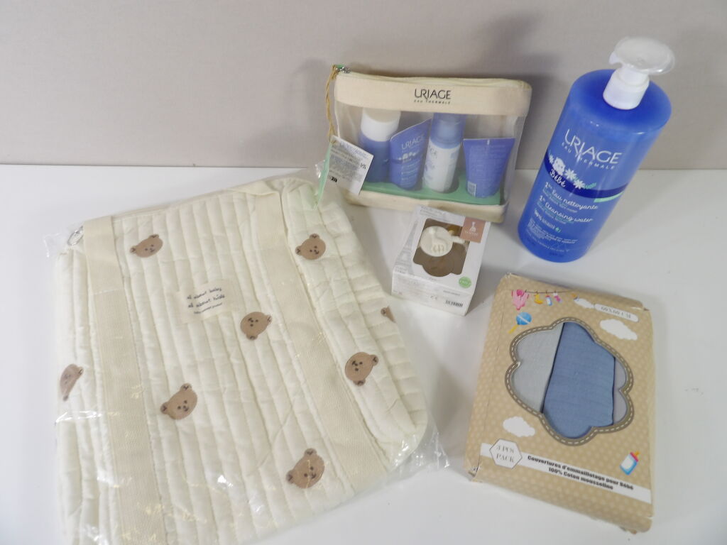 PRENDRE SOIN DE BÉBÉ : Lot de x5 articles neufs: SONARIN Sac à langer beige avec petits oursons, x3 couvertures d'emmaillotage 60x60; Eau de soin parfumée SOPHIE LA GIRAFE 50ML, Trousse soins URIAGE BÉBÉ Soins dermo-pédiatriques éco responsables; et 1ere eau nettoyante 1L (descellé).