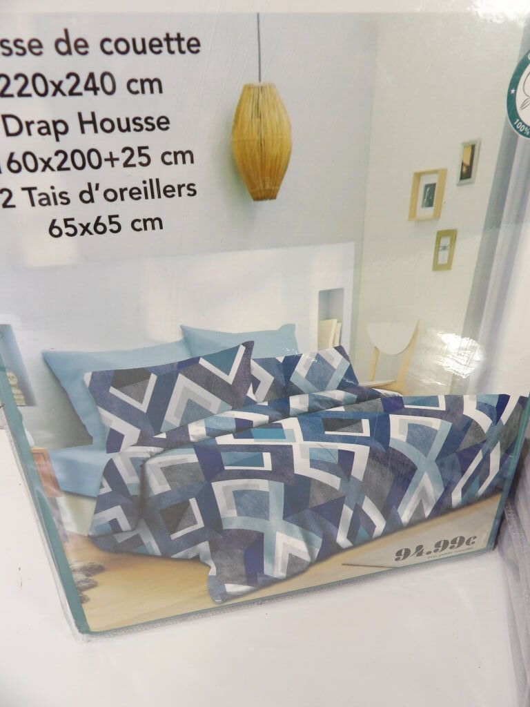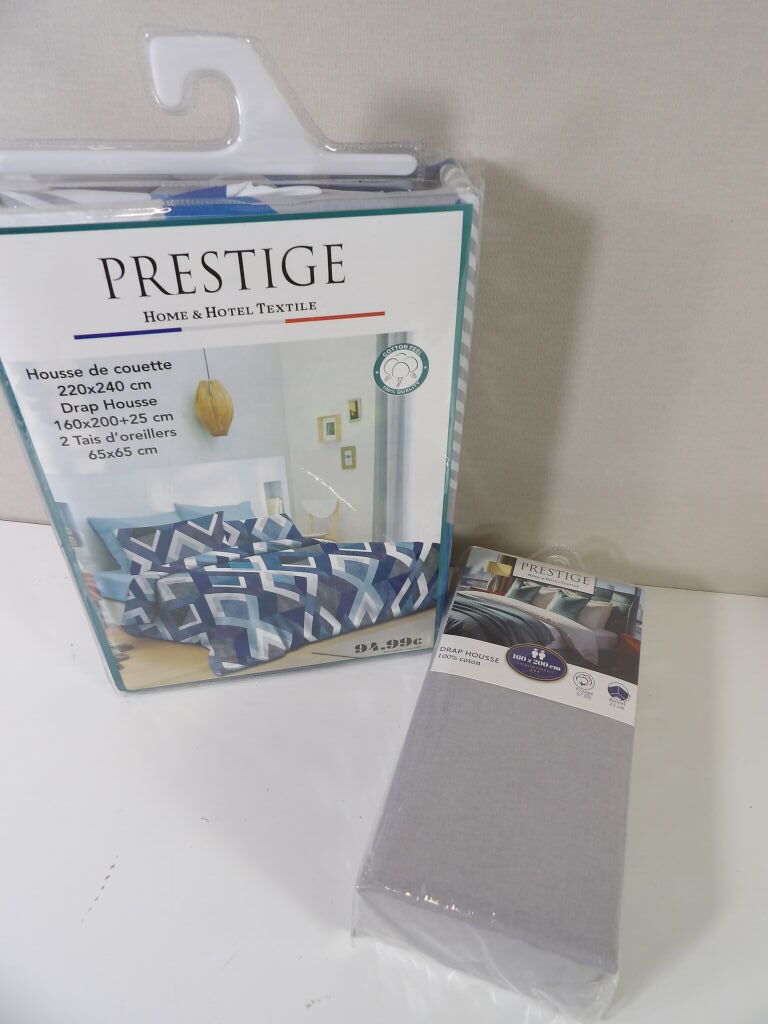 PRESTIGE Parrure de lit: Housse 220x240cm, Drap housse 160x200 +25cm, et 2 taies d'oreillers 65x65cm. On y inclut un drap housse 100% Coton de la même marque.