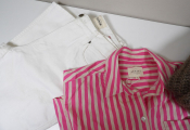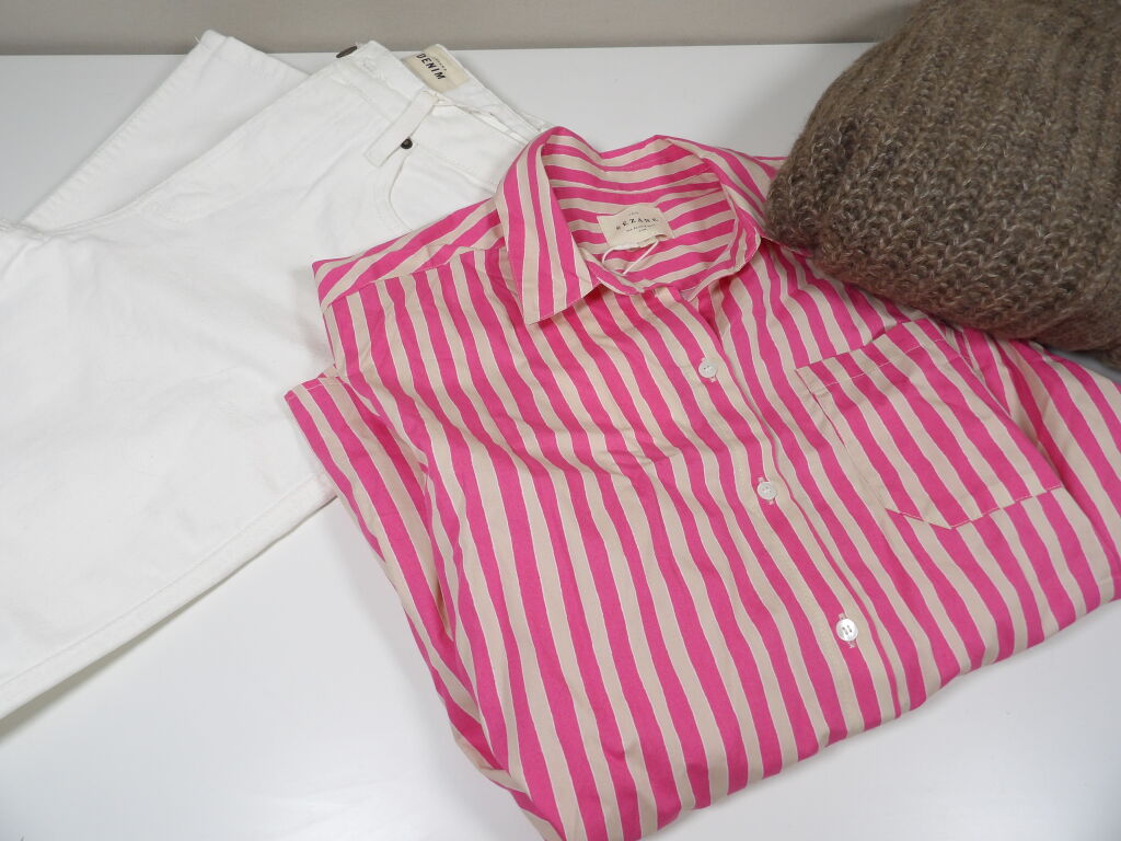 SEZANE - Un ensemble de trois articles en Taille S : Gilet EMILE Taupe , Jeans Brut sexy Tall (T.27) et pour compléter le look : une chemise rayée rose et ecru MAX.