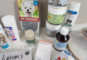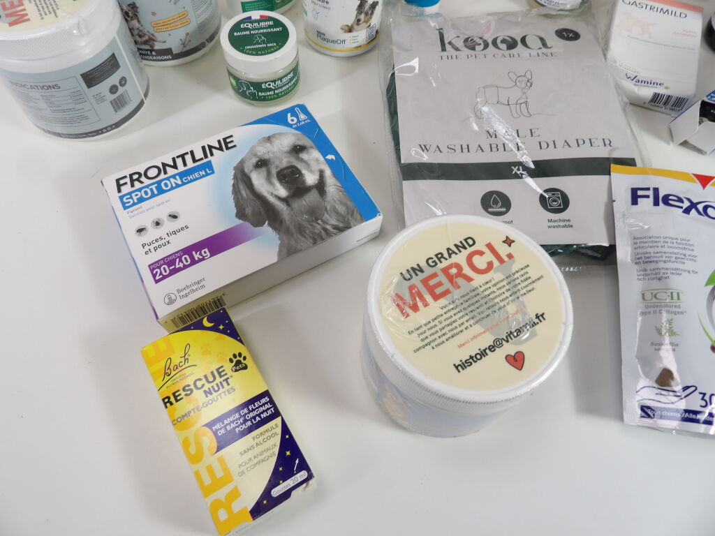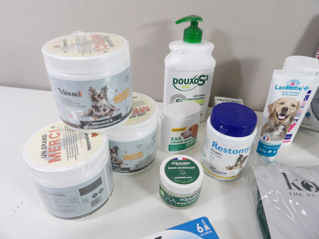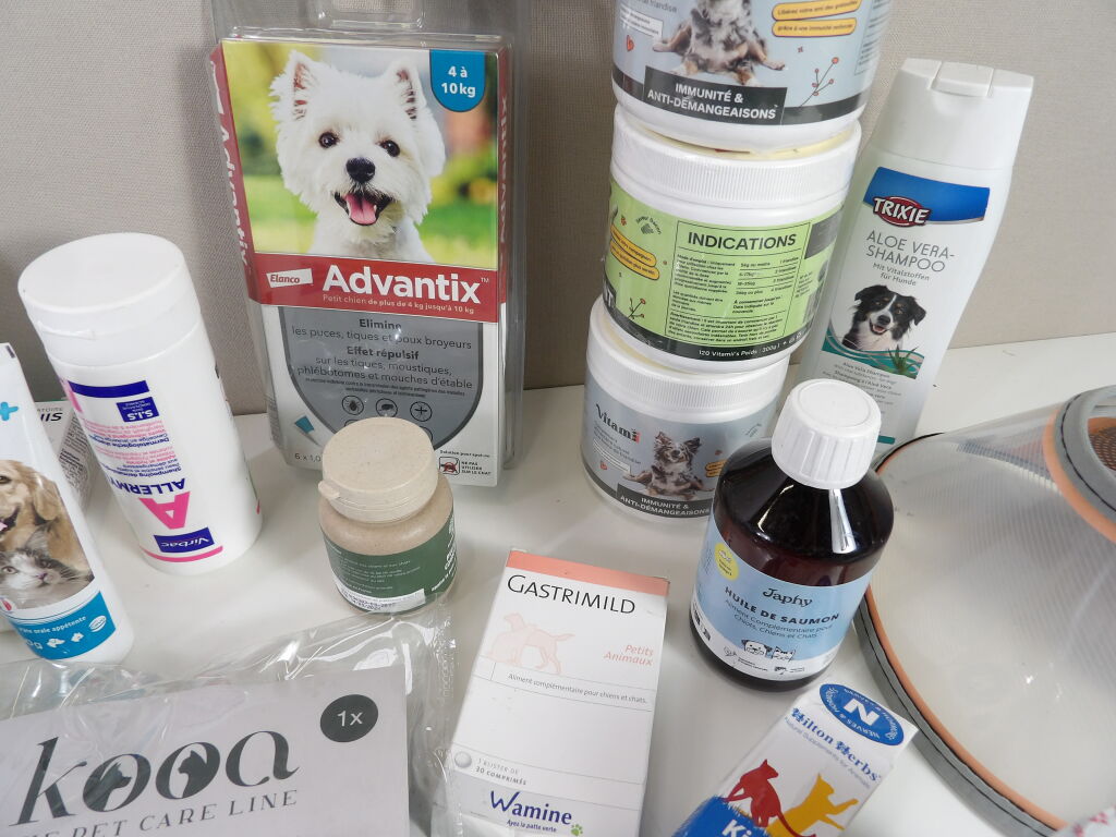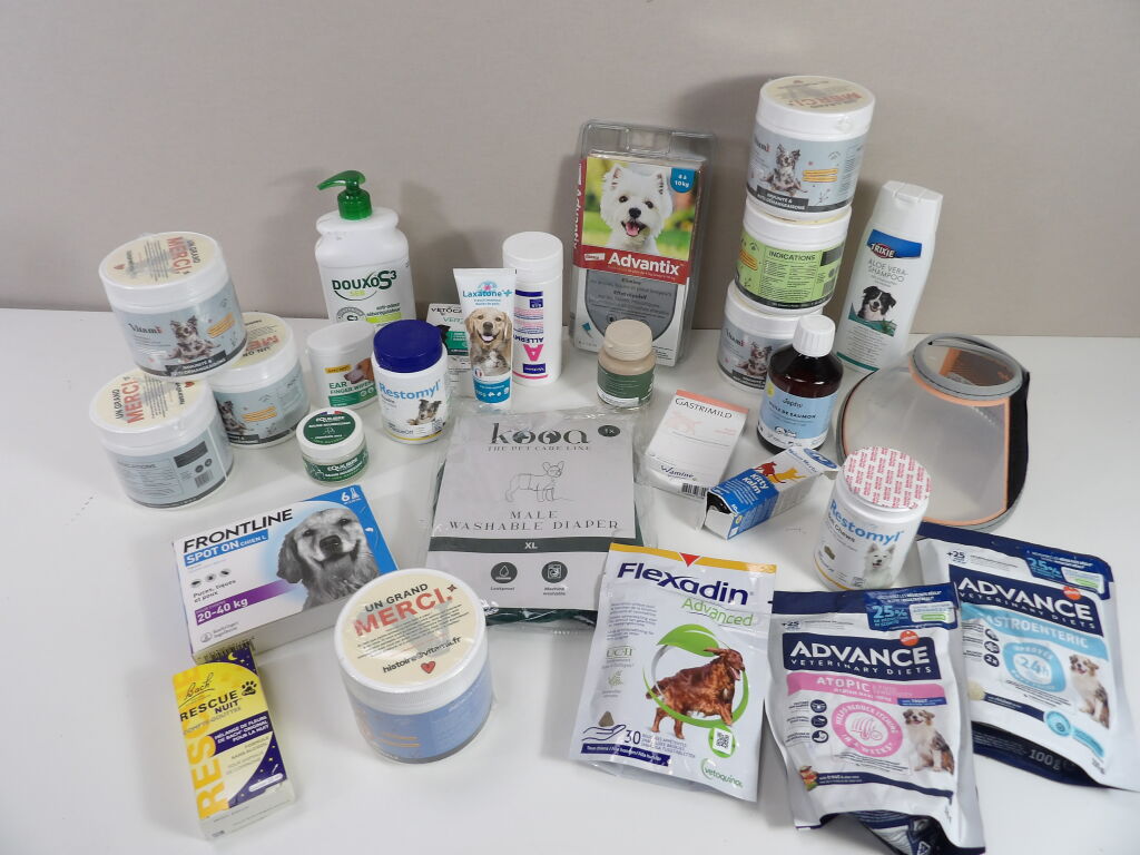 SOINS du chien : Lot de divers : anti-parasitaires, compléments alimentaire, shampoing, colerette, couche, aide à l'hygiène digestive ....