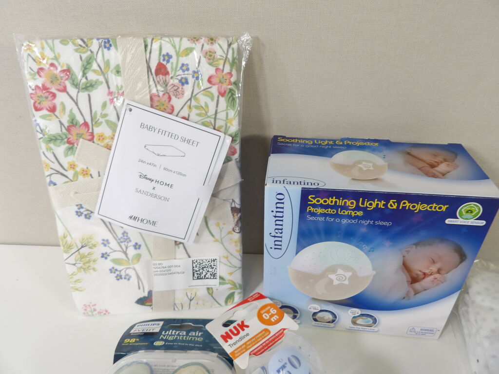 SOMMEIL pour BÉBÉ lot de articles neufs et occasion: x2 attaches sucettes Biolane, x2 packs de tétines 0-6 mois, des petites décorations phosphorescentes, x1 veilleuse, x1 VERBAUDET housse de couette 140x200 + taie d'oreiller 50x75cm et on y inclut x1 drap pour matelas à langer H&M Home x Disney Home 60x120CM neuf.