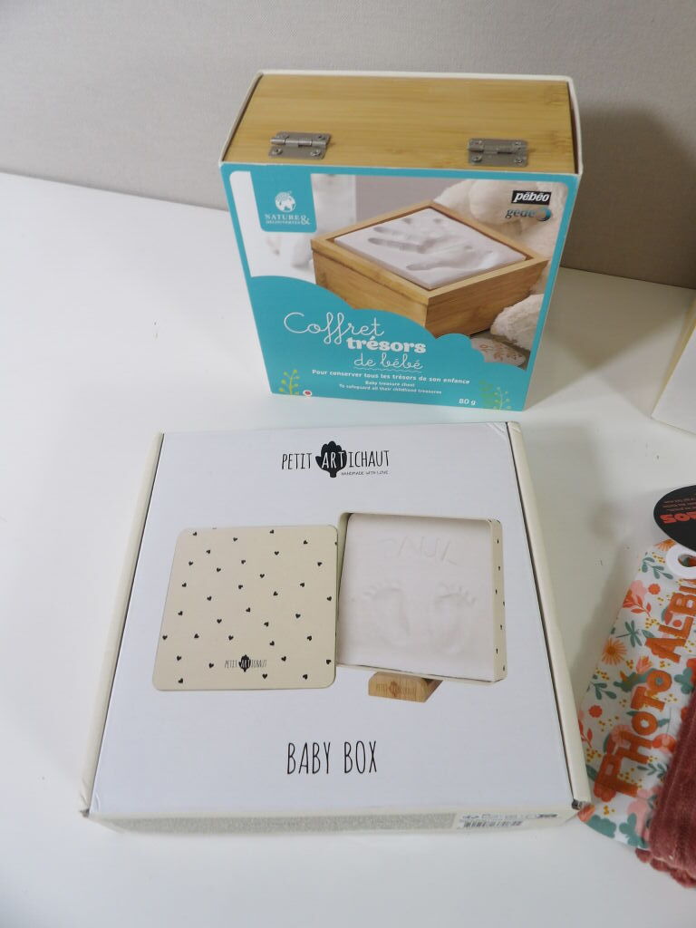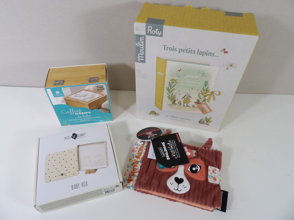 SOUVENIRS : Créer les de vos enfants avec ces 4 articles neufs (certaines boites descellées): Déglingos - Album Photo en tissu ; Nature et Découvertes coffret trésors de bébé, Petit Artichaut BABY BOX, et MOULIN ROTY Trois petits lapins le Coffret naissance souvenirs Box.