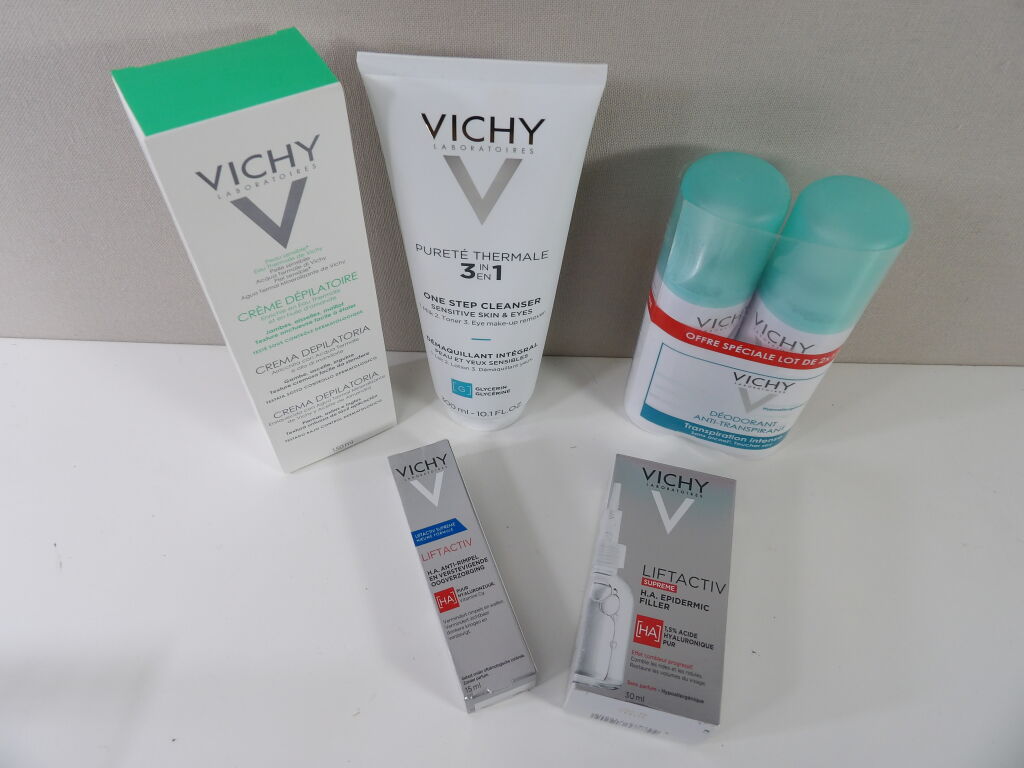 VICHY Lot de x6 articles x1 Démaquillant intégral peau et yeux sensibles 300ML, x1 crème dépilatoire 150ML, x1 Liftactiv supreme H.A Epidermic Filler 30 ML, x2 Déodorant anti transpirant 125ML, x1 Liftactiv soin yeux H.A. Anti rides raffermissant 15ML.