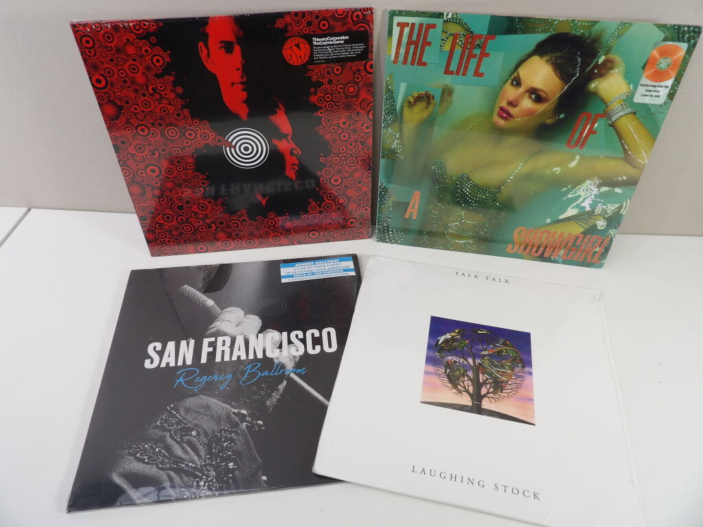 VINYLES Lot de x4 neufs sous blisters : TAYLOR SWIFT The life of a show girl, JOHNNY HALLYDAY Regency Ballroom San Francisco, Talk Talk Laughing Stock, et Thievery Corporation The Cosmic Game.