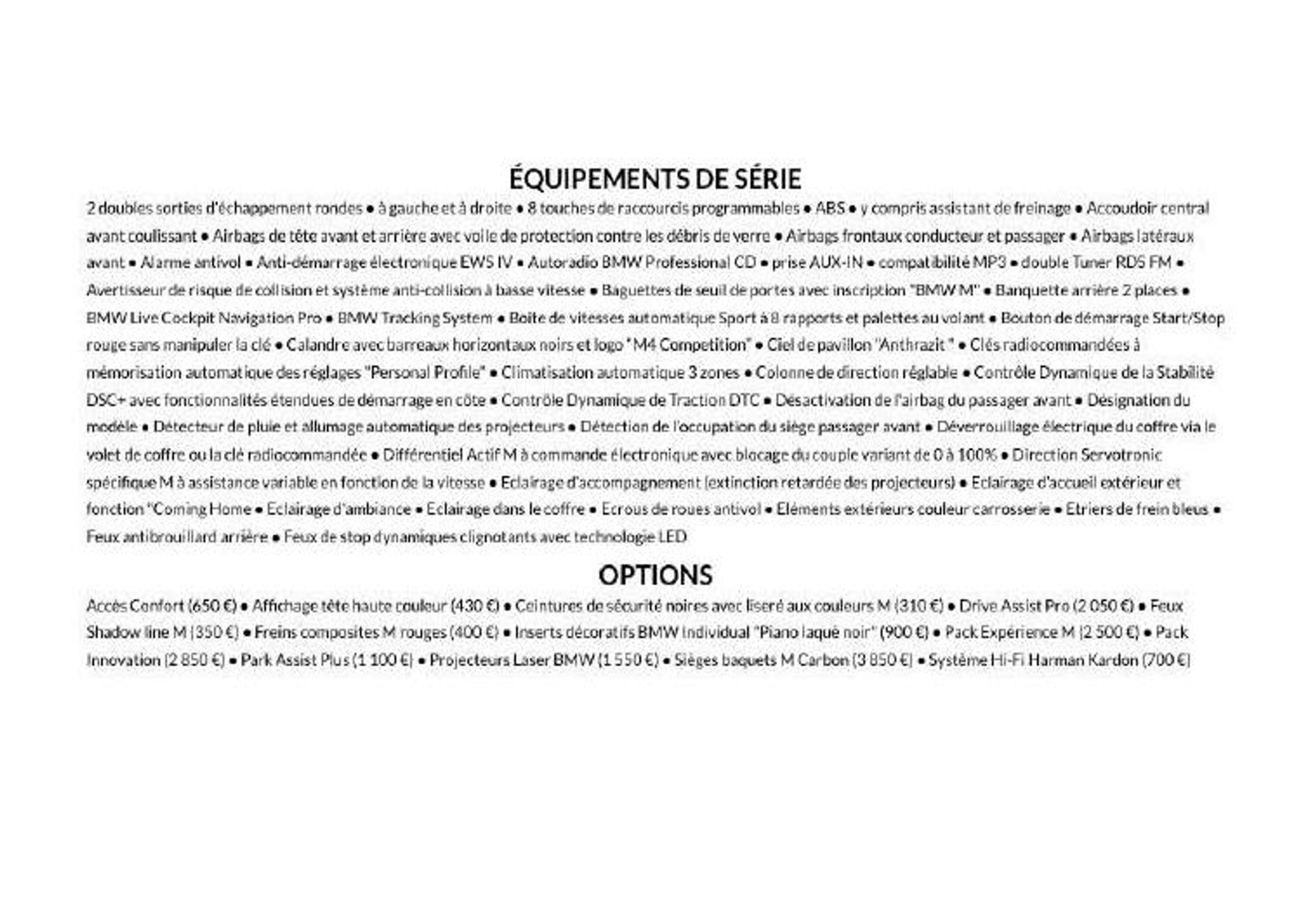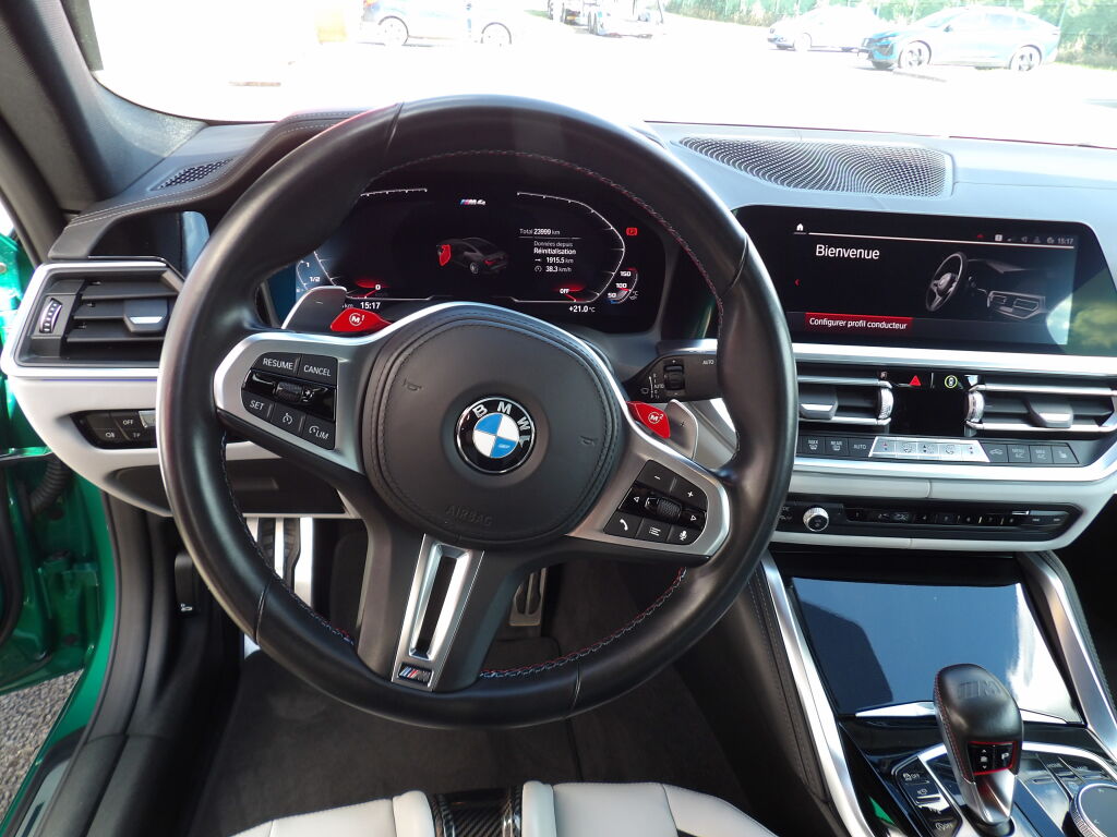 - Nombreuses options dont les sièges compétition (baquets M Carbon), le système Hi-Fi Harman Kardon, le Park assist Plus, les projecteurs laser BMW, le pack innovation, le Drive assist Pro, les inserts décoratifs BMW Individual en " Piano laqué noir "...